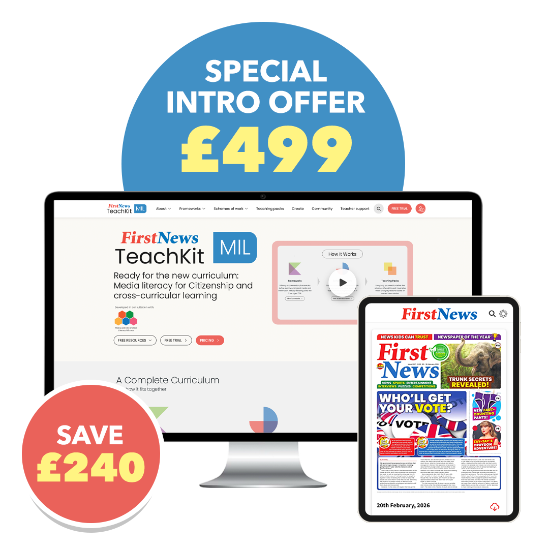 Our impartial, age-appropriate journalism through First News Digital helps young people understand the world around them. Match this with our TeachKit of media literacy resources, closely tied to the news, and you’ll ensure learners don’t just read the headlines – they read between them too. Get this package for just £499, saving £240 when buying the products separately. Plus, receive a £100 book voucher for your school. This is an introductory offer for the first year of subscription only. Ts&Cs apply.